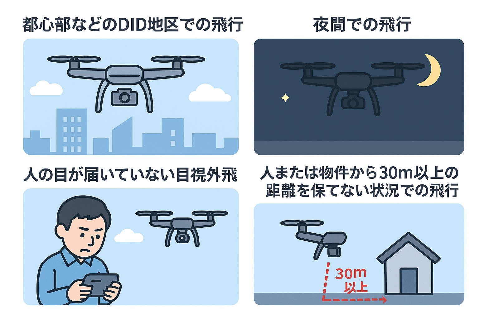 ★30m未満の飛行とは?ドローンを飛行させる際、航空法で定められた「地上又は水上の人又は物件との間に30m以上の距離を保つ」というルールがあります。この距離を保てない飛行は「特定飛行」に該当し、原則と ...