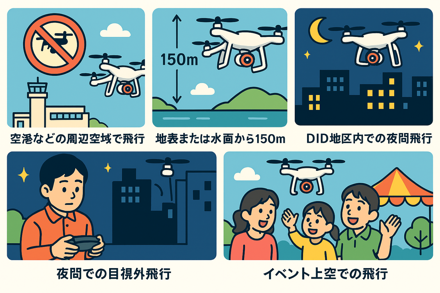 ・都心部などの人口集中地区(DID地区とも呼ばれます)での飛行の禁止